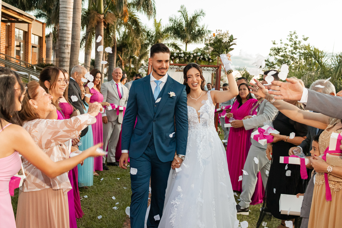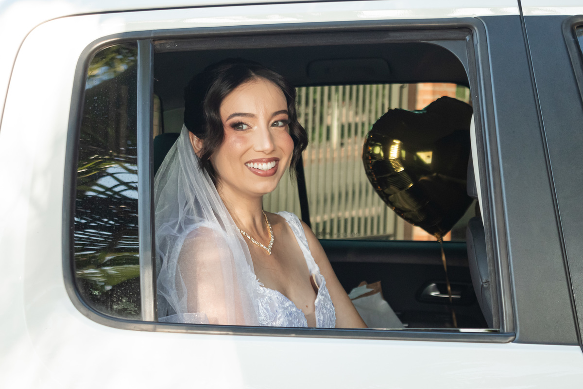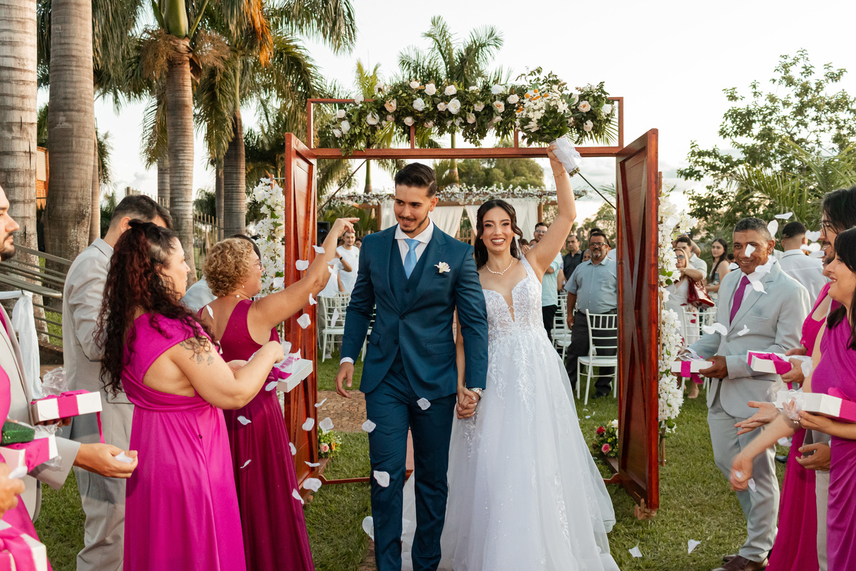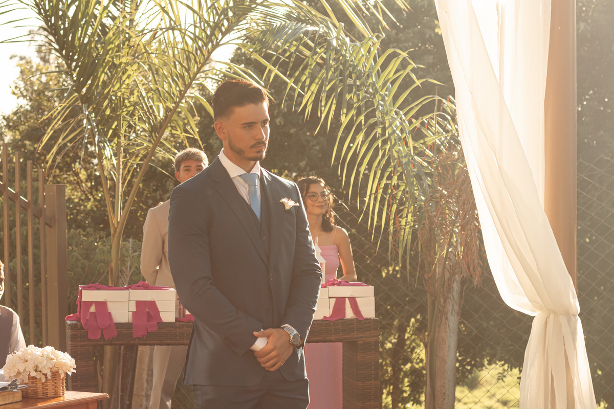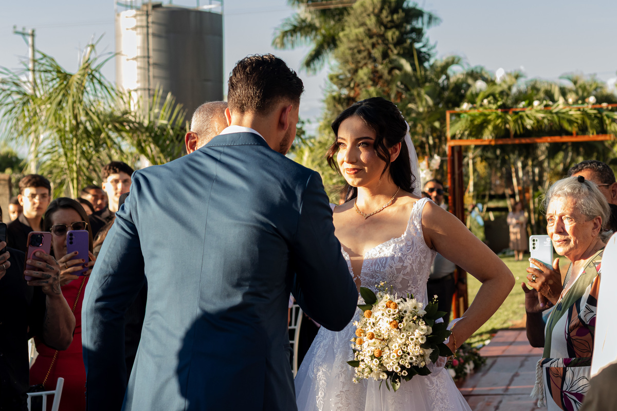 Raquel surgiu envolta em delicadeza. O vestido parecia acompanhar seus movimentos com leveza, o véu dançava junto ao vento e o rosto carregava a beleza de quem vive um amor tranquilo e profundo. Havia calma em seu olhar. Uma certeza silenciosa. Como quem sabe que chegou exatamente onde deveria estar.