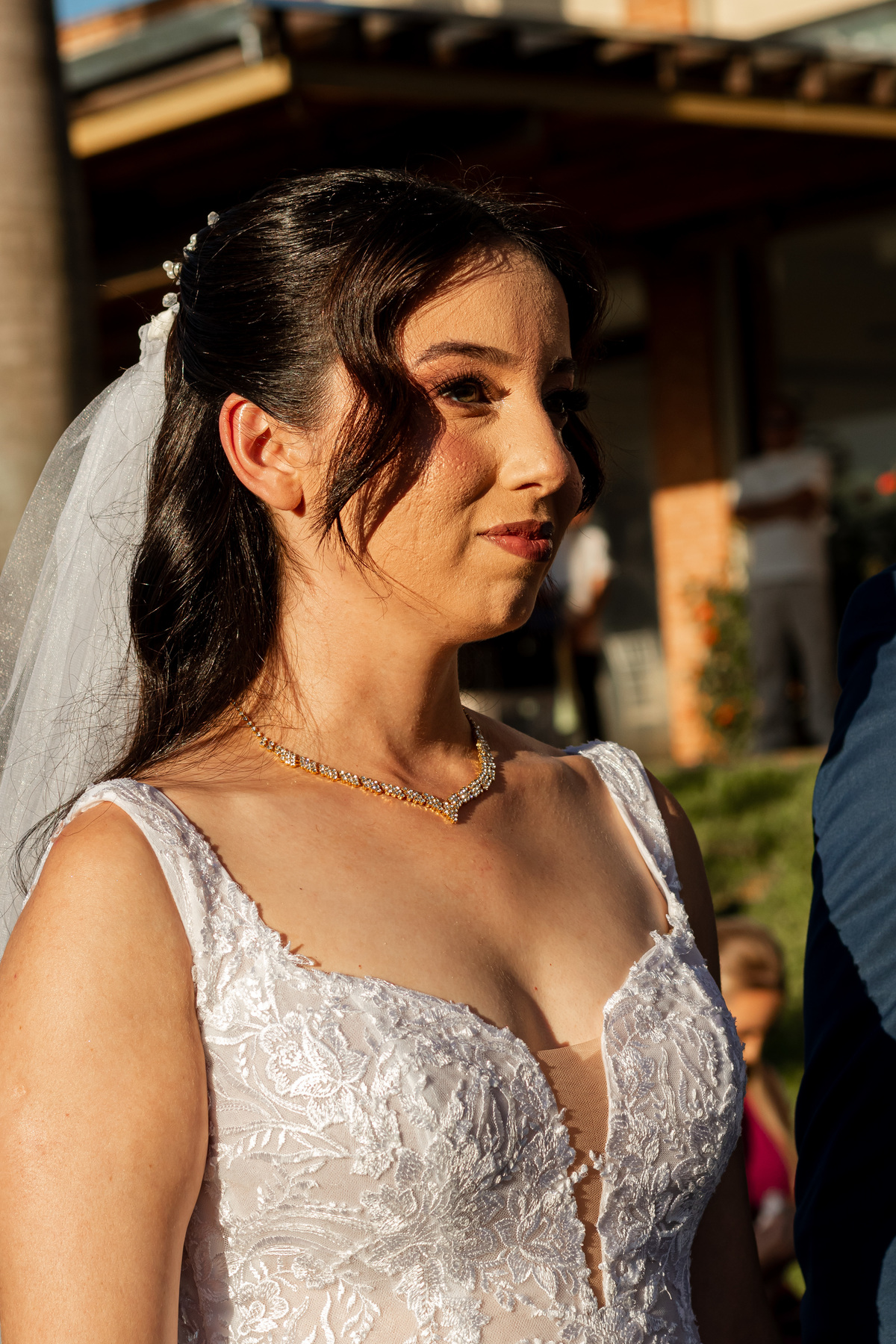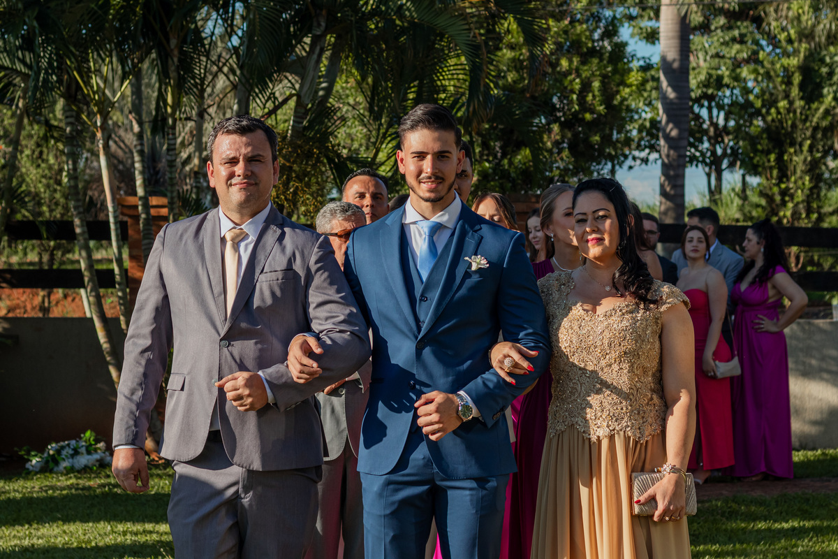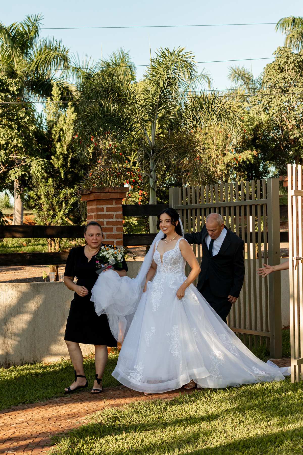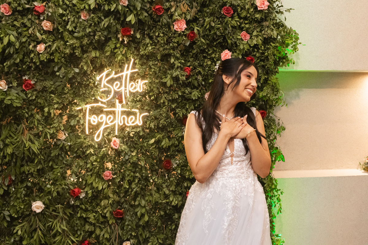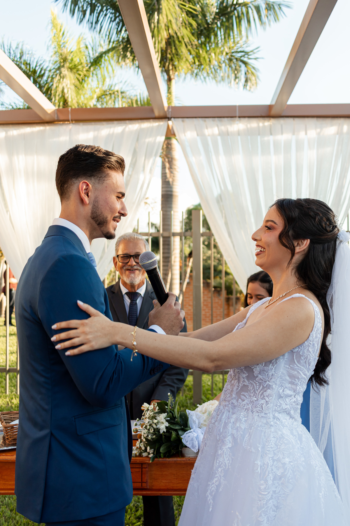 Raquel surgiu envolta em delicadeza. O vestido parecia acompanhar seus movimentos com leveza, o véu dançava junto ao vento e o rosto carregava a beleza de quem vive um amor tranquilo e profundo. Havia calma em seu olhar. Uma certeza silenciosa. Como quem sabe que chegou exatamente onde deveria estar.