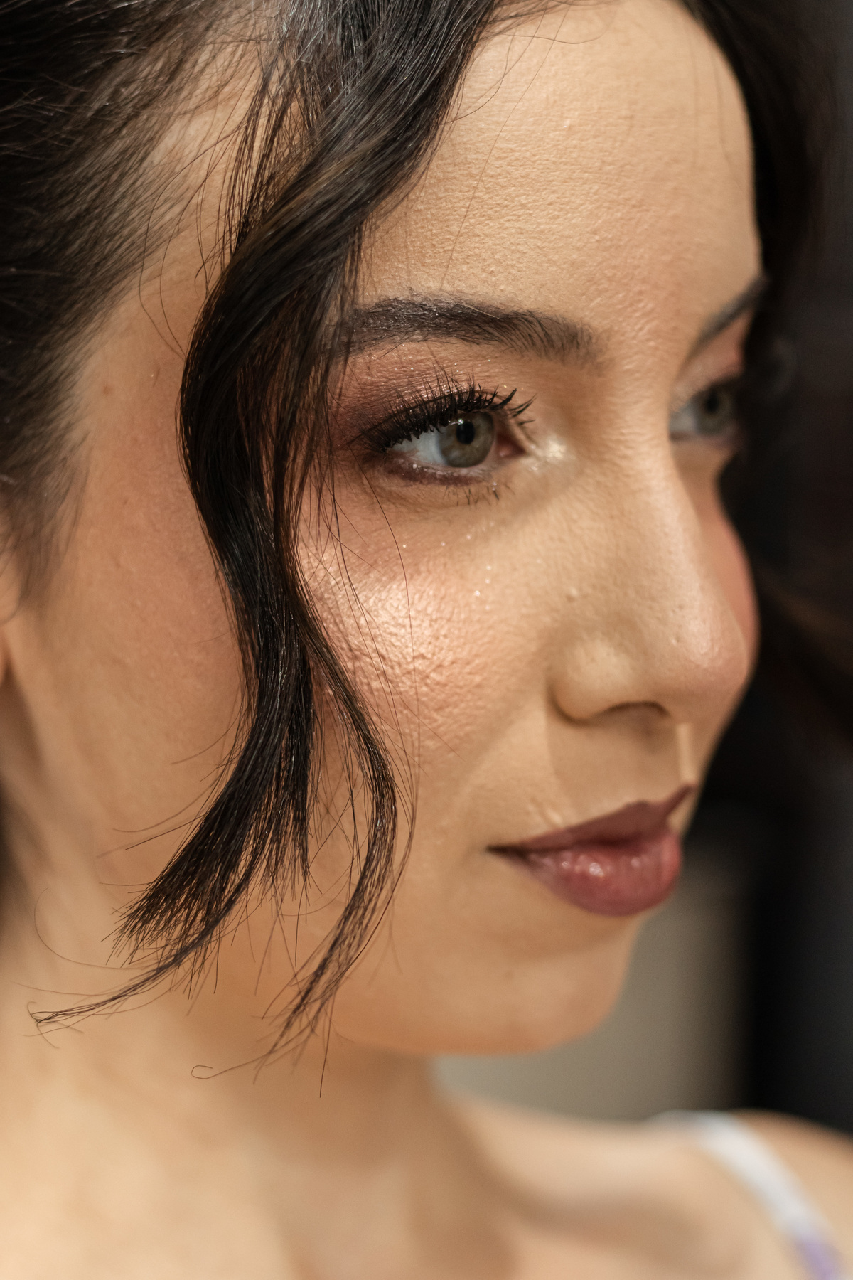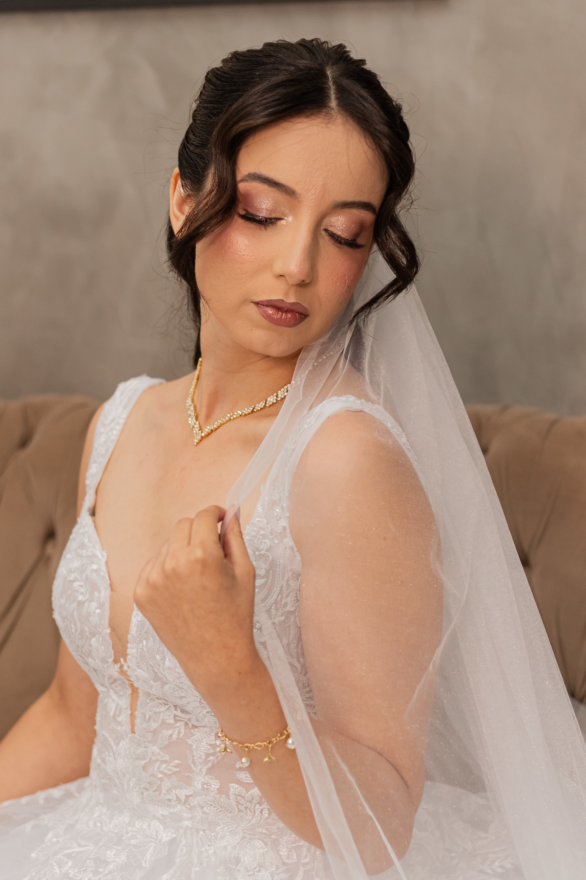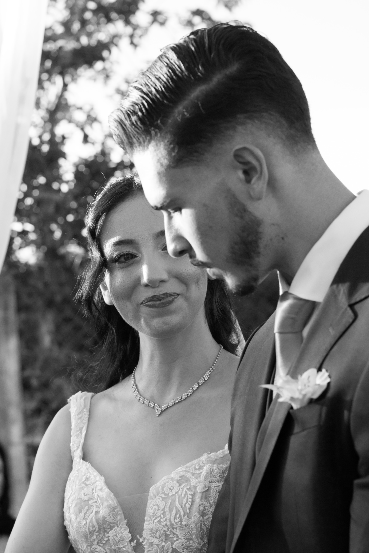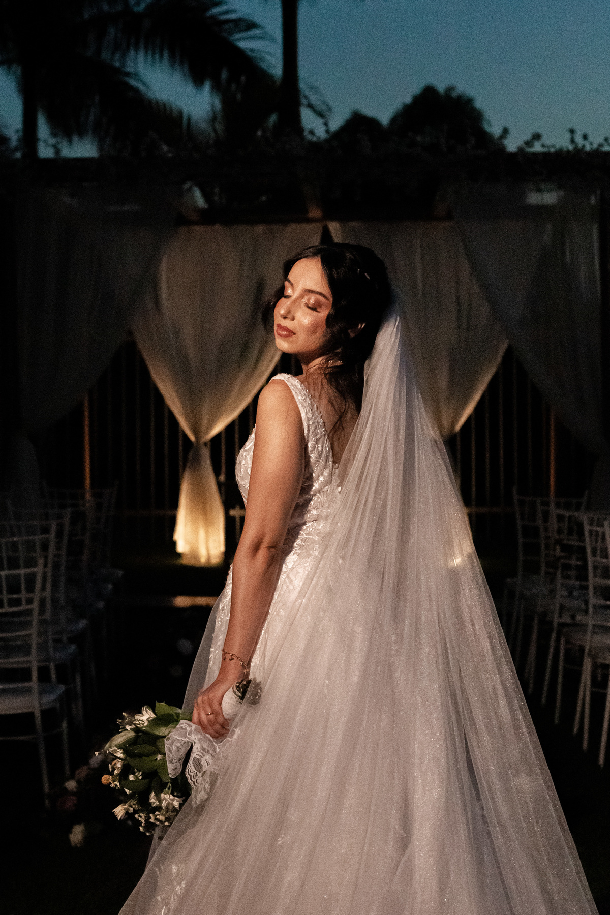 Raquel surgiu envolta em delicadeza. O vestido parecia acompanhar seus movimentos com leveza, o véu dançava junto ao vento e o rosto carregava a beleza de quem vive um amor tranquilo e profundo. Havia calma em seu olhar. Uma certeza silenciosa. Como quem sabe que chegou exatamente onde deveria estar.