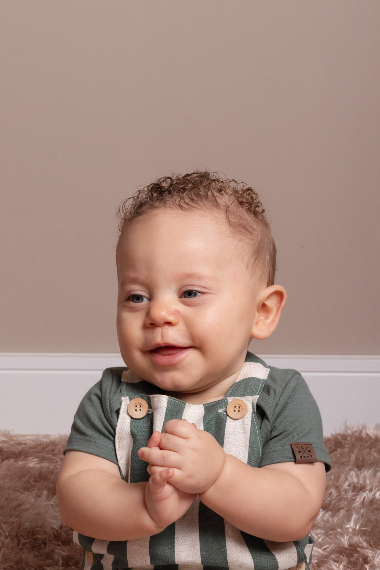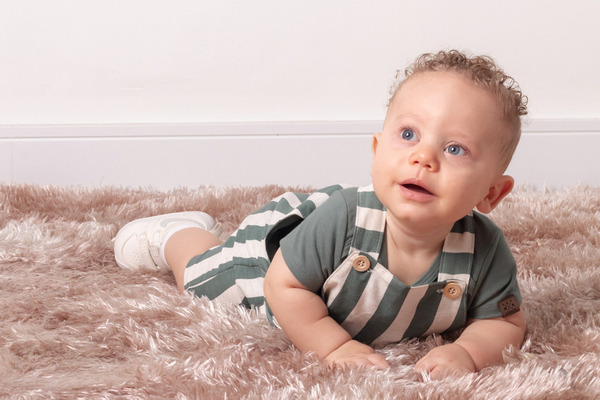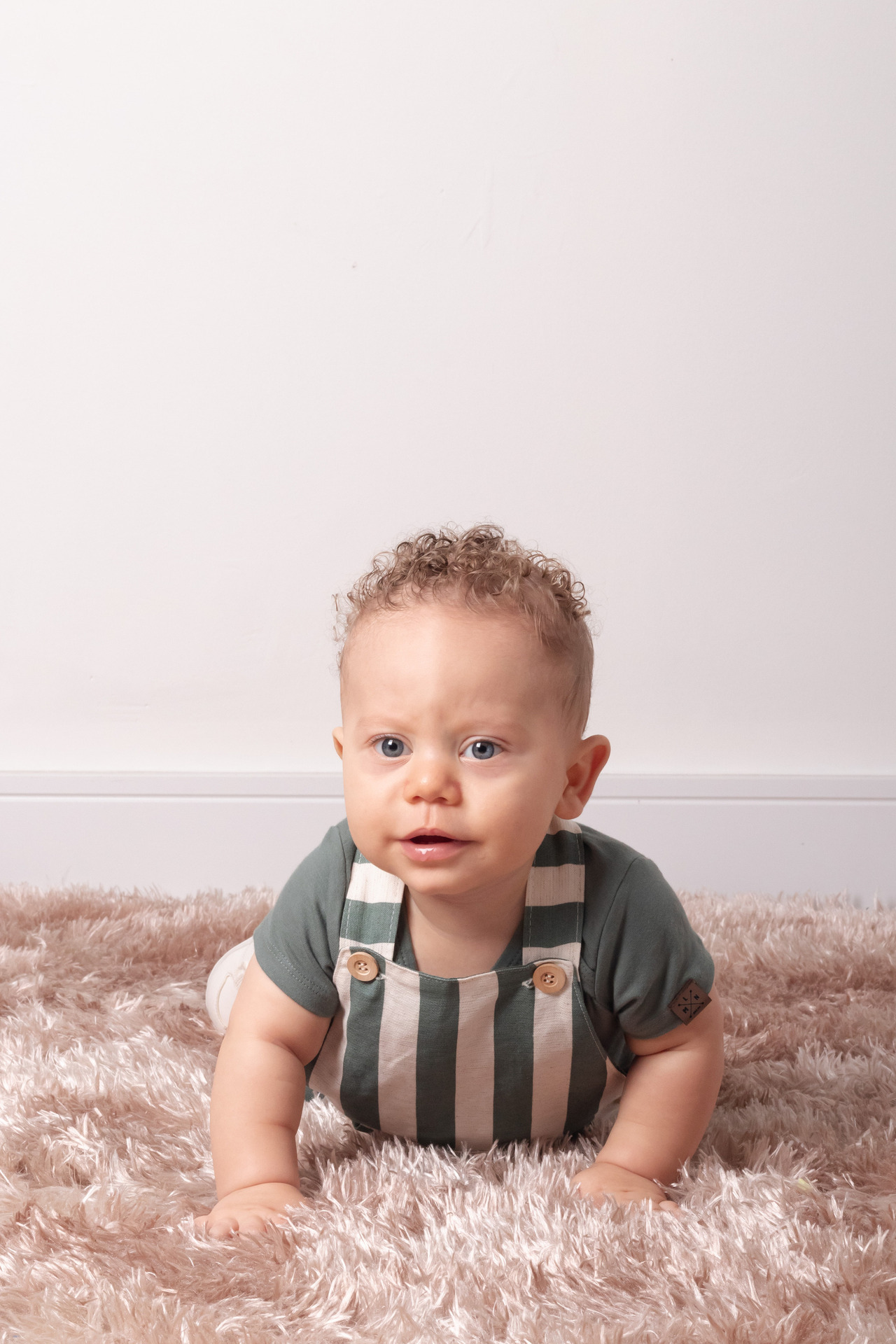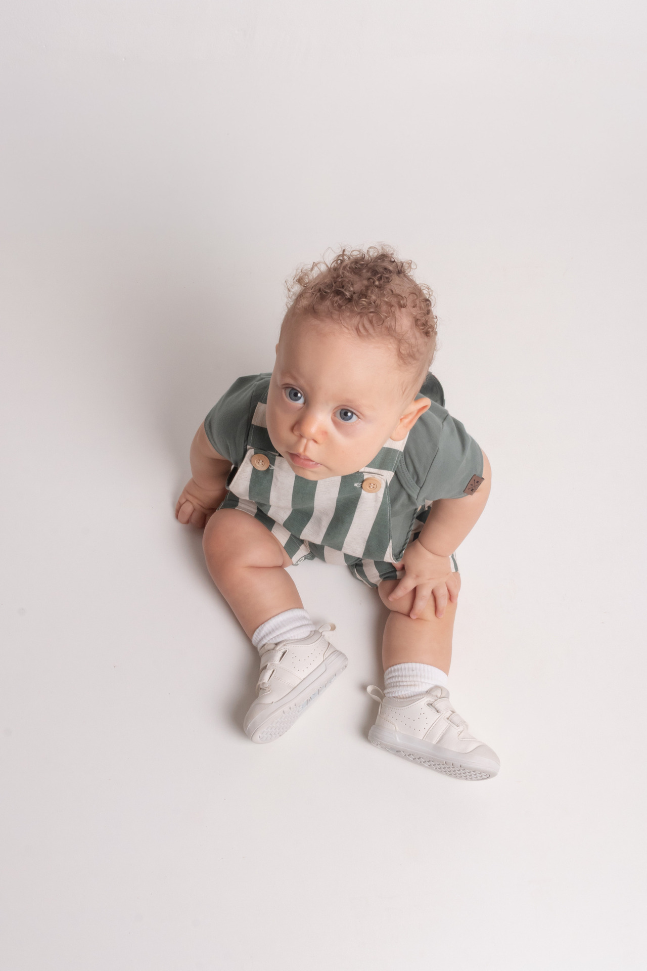 O Isaac deu um show de carisma! Com seus cachinhos dourados e olhos expressivos, cada clique revelava uma nova descoberta. Optamos por um figurino clássico (o macacão listrado verde ficou perfeito!) e um cenário minimalista para que a personalidade dele fosse a verdadeira protagonista das fotos.