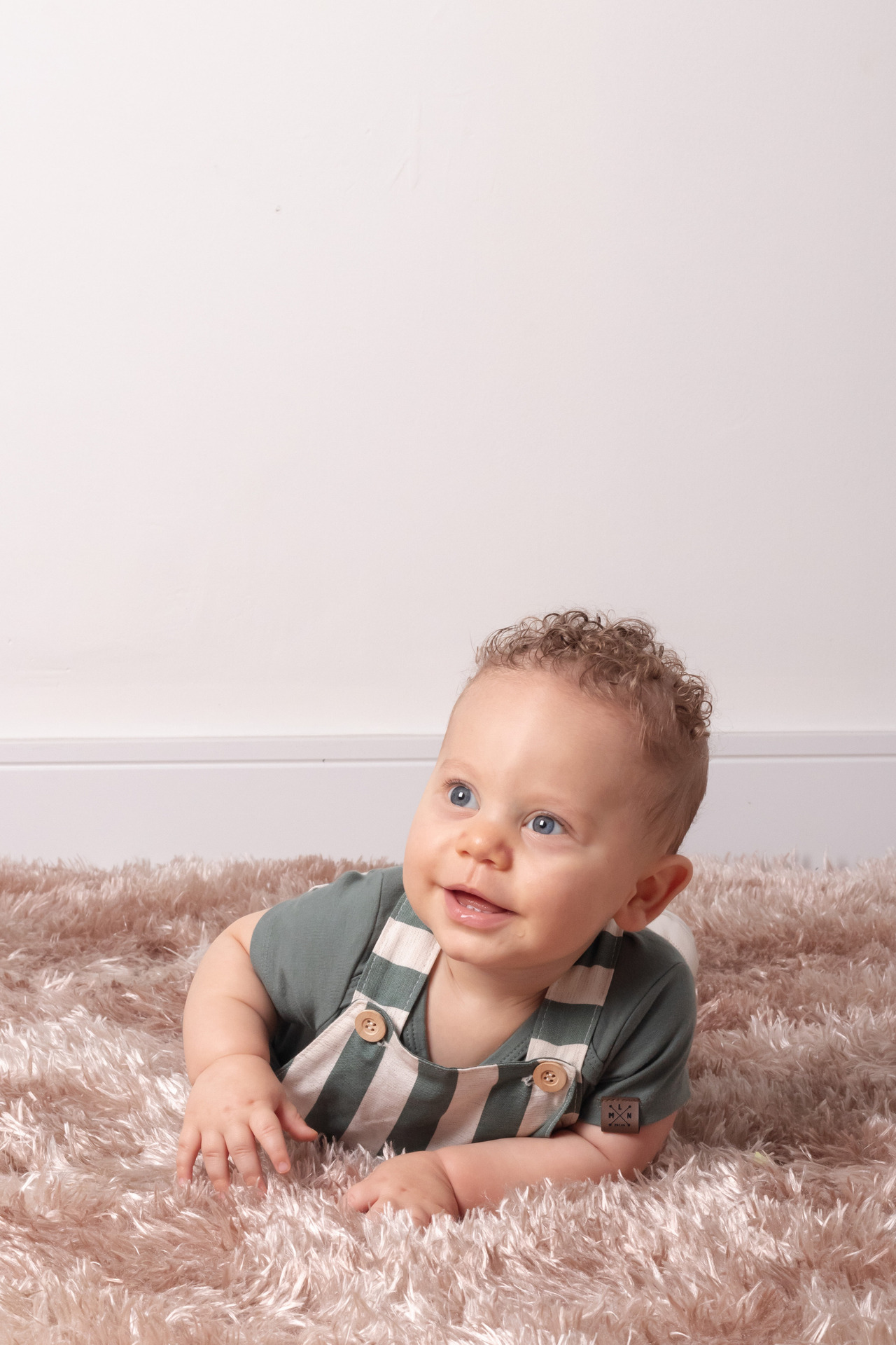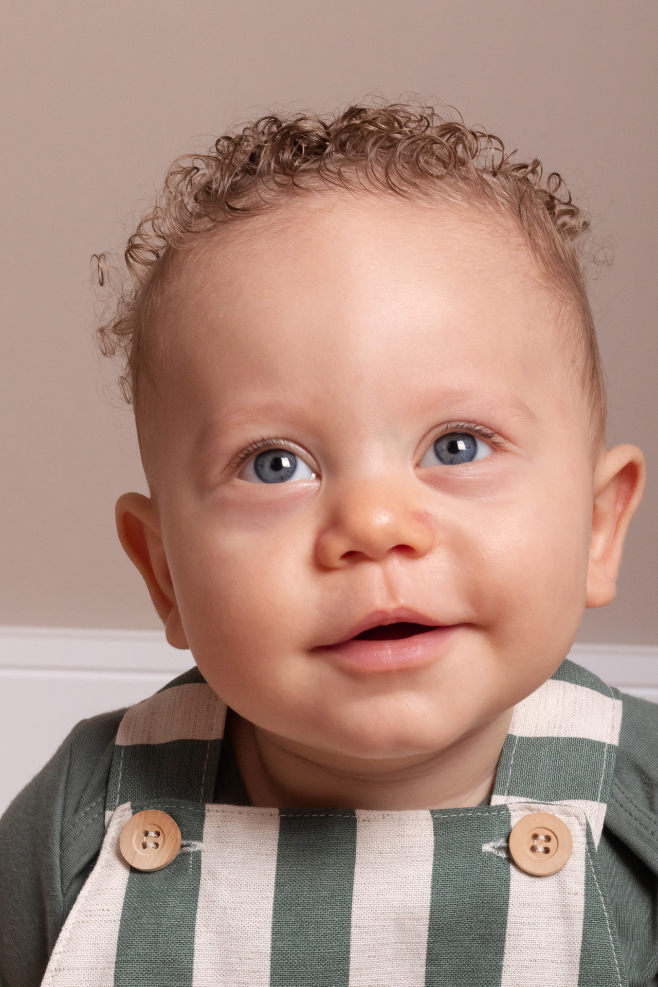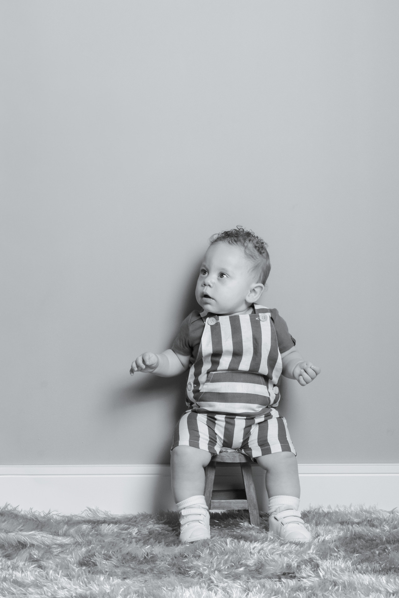O Isaac deu um show de carisma! Com seus cachinhos dourados e olhos expressivos, cada clique revelava uma nova descoberta. Optamos por um figurino clássico (o macacão listrado verde ficou perfeito!) e um cenário minimalista para que a personalidade dele fosse a verdadeira protagonista das fotos.